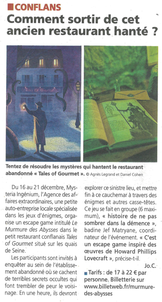 À l’occasion du futur changement de propriétaire et fermeture du restaurant Tales Of Gourmet, l’événement Le Murmure des Abysses propose une expérience immersive unique. En partenariat avec Mysteria Ingénium, cet escape game d’investigation transporte les participants dans un restaurant désaffecté, plongé dans une atmosphère mystérieuse et captivante, inspirée des mythes et légendes lovecraftiennes comme le mythe de Cthulhu. Cette ambiance est parfaite pour les amateurs de jeux de rôle et de sensations fortes. Les participants doivent résoudre des mystères pour percer les secrets de ce lieu énigmatique. C’est l’occasion de vivre une aventure inoubliable avant la transition du restaurant vers une nouvelle ère.